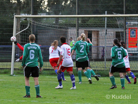 Das erste Tor der Parte gelang jedoch den Gästen. Nach 13 Minuten passte Jette Socolowsky zu ?Sandra Jahn und diese traf zum 0:1. Eine gute Kombination beider und Bautz hatte beim Heber über sie hinweg keine große Abwehrchance. Die verdiente Führung.